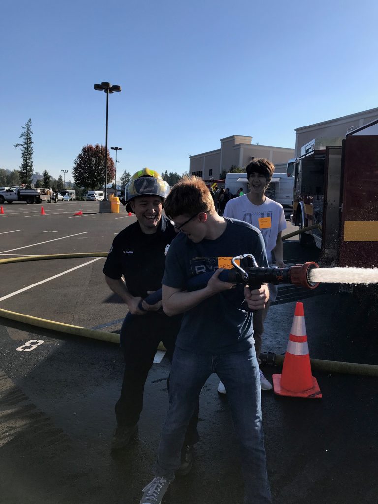 David Smith, Roseburg Firefighter instructs William Wilson and Jackson Booth, both from Grants Pass High school in the finer points of handling a powerful fire hose during the 1st Biennial Southern Oregon Trades Expo held at the 7 Feathers Convention Center, September 28th, 2017.